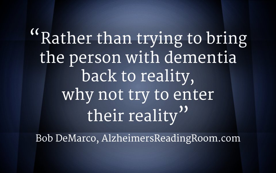 Reality in Alzheimer's World is a reflection of what the person living with Alzheimer's thinks and believes. It is this reality that you must focus on, not the way YOU think things are, or should be.
